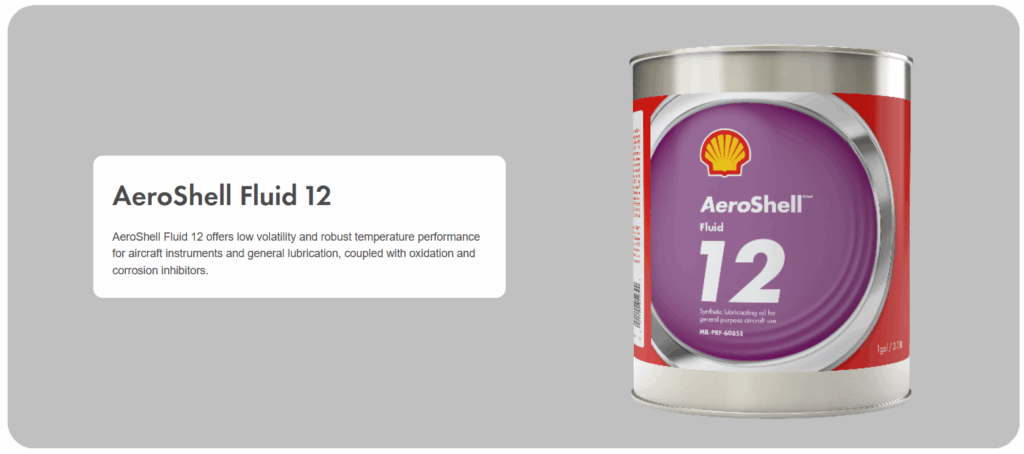 AeroShell Fluid 12 is used for general aircraft lubrication as well as for aircraft gyro instrument gimbal bearings, separately lubricated high-speed turbines and compressors, aircraft air cycle equipment and electronic equipment. AeroShell Fluid 12 is particularly suitable for use when an oil with a low evaporation rate is required at high and low temperatures.
